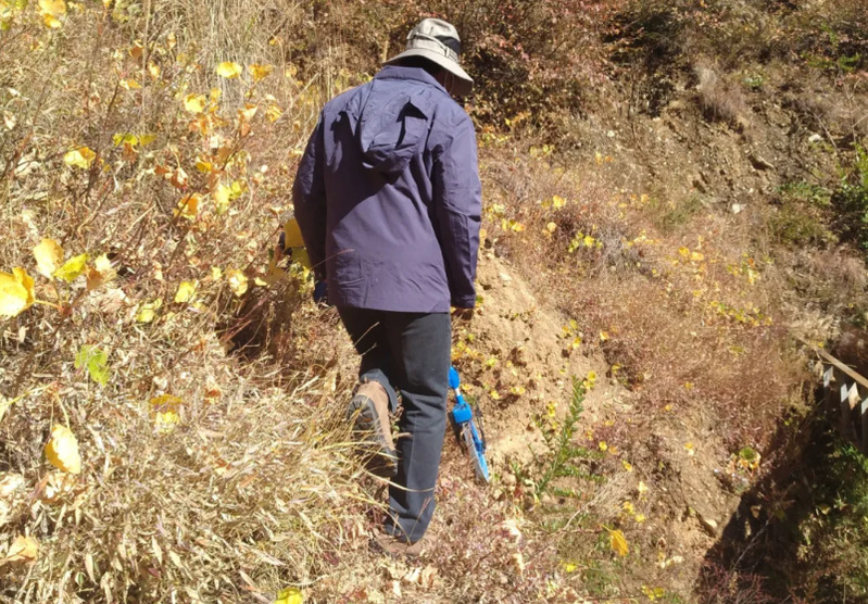 王洪涛和同事走向干沟渠,望着挂满尘土的灌木和脚下锋利的碎石,心想裤子又要被挂破几个洞了。路上满枝尘土的灌木会给裤腿染上洗不掉的红色,这山上的石头也是毁鞋利器,他又不免担心起自己的鞋子。